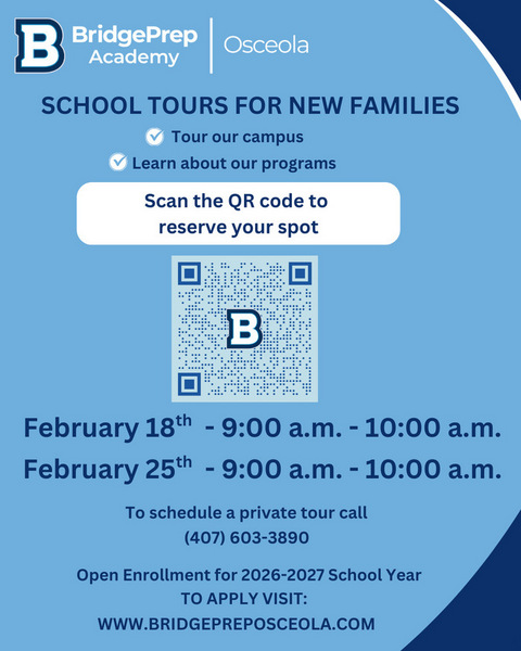 Come and see all BridgePrep Academy of Osceola Campus has to offer. Enrollment is open for students in grades K-8. Our school is small, safe, quaint and has a personal environment. We offer before and after care, a dual language program, a positive behavior system, and much more. Scan the QRcode to reserve your spot ⭐ or follow this link.